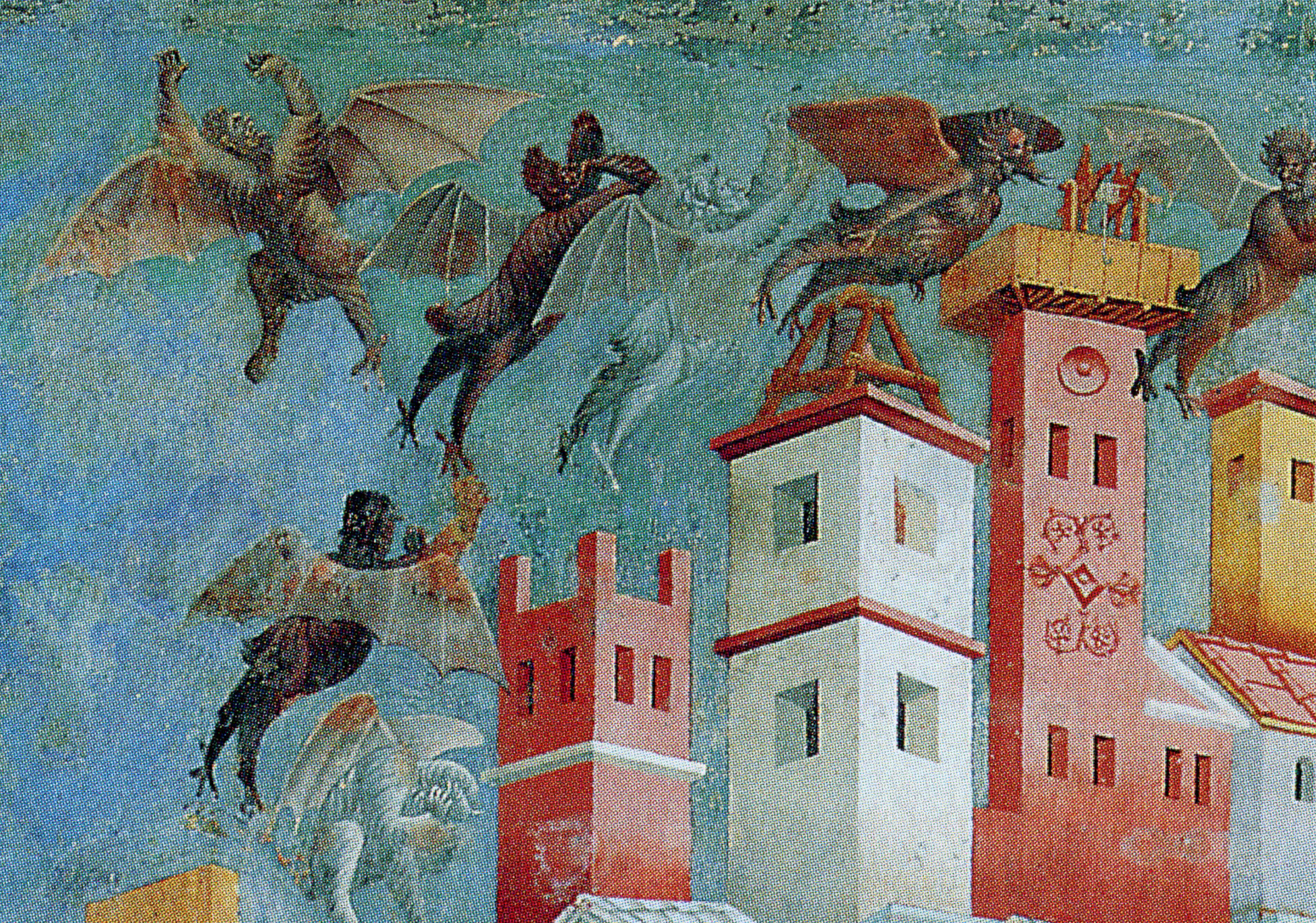 Moreover, there is an interesting element employed just to the right of St. Francis and Fr. Sylvestro, though we tend to overlook it due to the focus of the more dramatic elements, namely the expulsion of the demons. This is the gates of the city. Here, we see two gates, a wide one and a narrow gate. From the wide gate the city’s bourgeois depart, yet through the narrow gate at the right a farmer and his donkey. This is a curious image, and it has a line of symmetry with the demons departing above. The narrow vs. the wide gate recall the Gospel of St. Luke, where our Blessed Lord declares that we should enter by the narrow gate, for the wide gate leads to perdition. There is a wider social commentary on the times, which predate Guelphs and Ghibellines, but focuses on the question of rich and poor, virtue and sin. Painters in Giotto’s day were considered craftsmen, and below a noble status, contrary to how artists would be viewed in the time of Michaelangelo, Raphael and Versari, or before we hit the contrasts of the noble and refined as in a Rubens or a Correggio, and the dysfunctional geniuses and social activists of a Caravaggio or a Rembrandt. Therefore painters are often looked down upon as men who work with their hands. In this Fresco, Giotto returns the compliment. The farmer leads his donkey out on the right, while the merchant goes out on the left. In a culture where such symbols mattered, the message was eminently clear, those who work with their hands will be saved by diligent work and prayer, those who are exceedingly wealthy, bankers, usurers, etc., are idle, and, well they are not going to be saved.